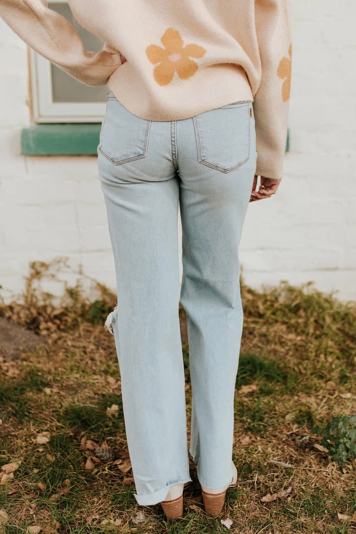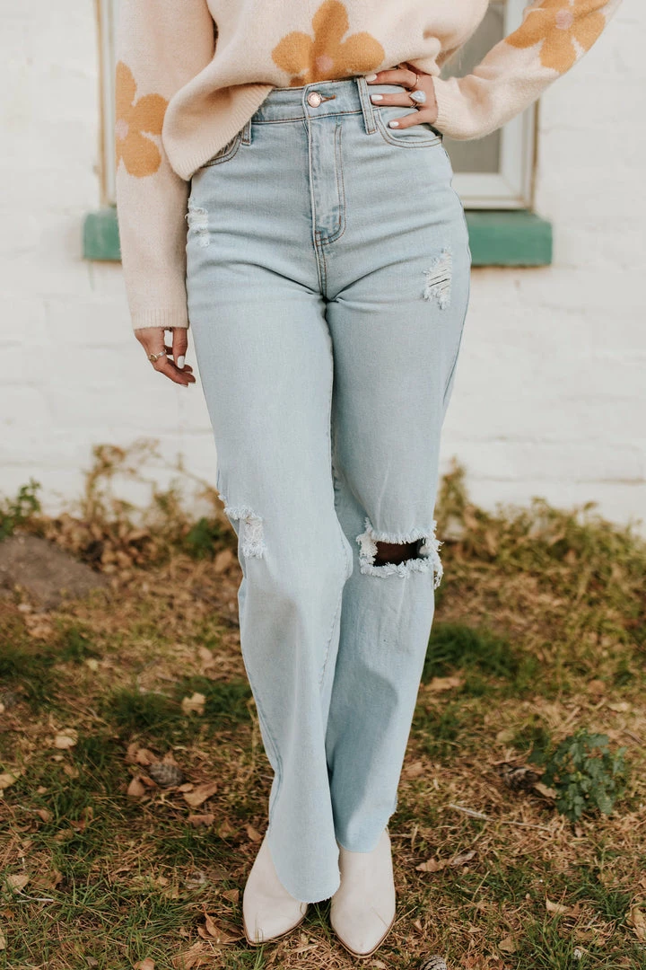 Feel like a rockstar in the Walk this Way Jeans! The extra wide cut, distressed knees, and raw hem are begging to be shown off like a cover of Rolling Stone!