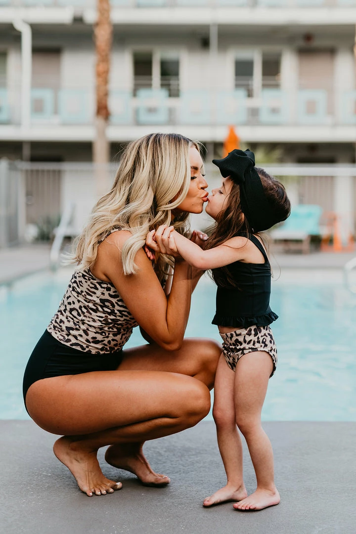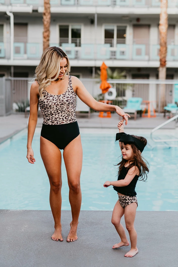 Button up that swimsuit babe, you’re looking good! Buttons never looked so good on a swimsuit! A new Pink Desert exclusive style for 2020, the Button Front Midkini Swim top in textured leopard. Hits at the smallest part of the waist, supportive shoulder straps, and a scoop-back neck. Buttons are functioning making it a perfect swimsuit for nursing mothers!